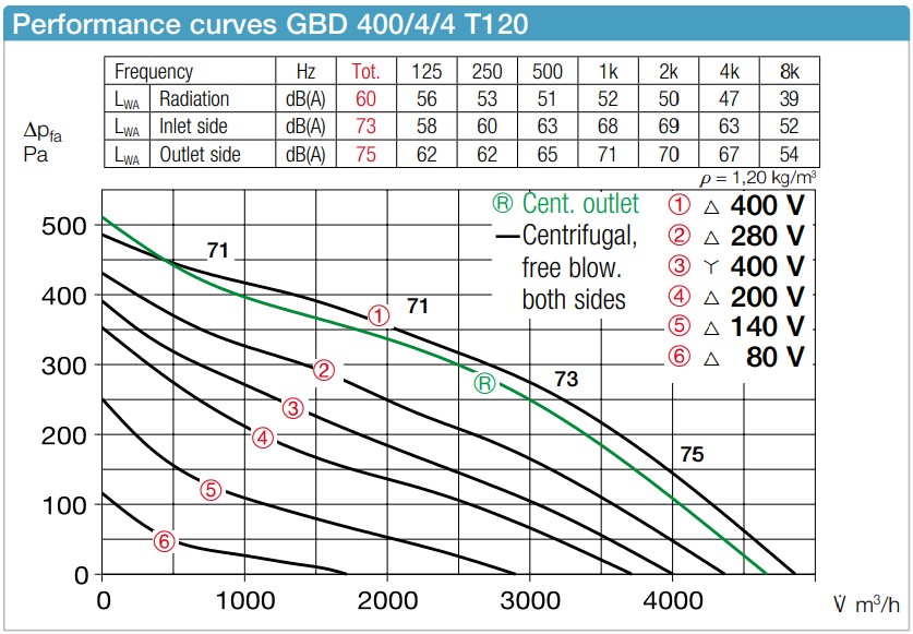 Φυγοκεντρική πτερωτή ελεύθερης λειτουργίας υψηλής απόδοσης με πλαστικά πτερύγια καμπυλωτά προς τα πίσω (πτερωτές αλουμινίου για GB T120), με απευθείας κίνηση. Ενεργειακά αποδοτική με χαμηλή εκπομπή θορύβου. Δυναμική ζυγοστάθμιση μαζί με τον κινητήρα σύμφωνα με το DIN ISO 21940-11 - βαθμός ποιότητας 2,5.