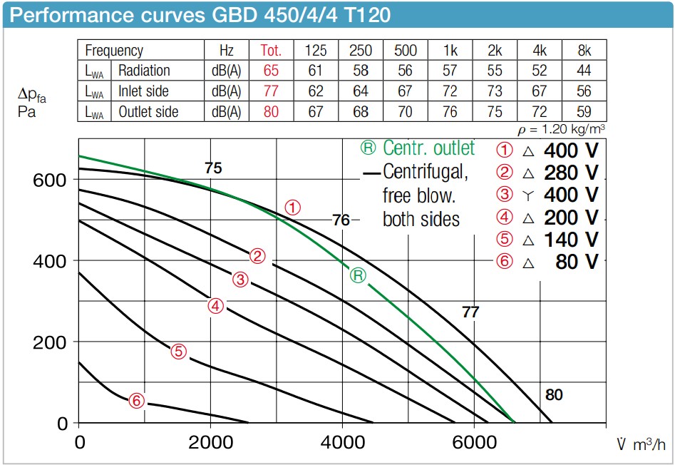 Φυγοκεντρική πτερωτή ελεύθερης λειτουργίας υψηλής απόδοσης με πλαστικά πτερύγια καμπυλωτά προς τα πίσω (πτερωτές αλουμινίου για GB T120), με απευθείας κίνηση. Ενεργειακά αποδοτική με χαμηλή εκπομπή θορύβου. Δυναμική ζυγοστάθμιση μαζί με τον κινητήρα σύμφωνα με το DIN ISO 21940-11 - βαθμός ποιότητας 2,5.