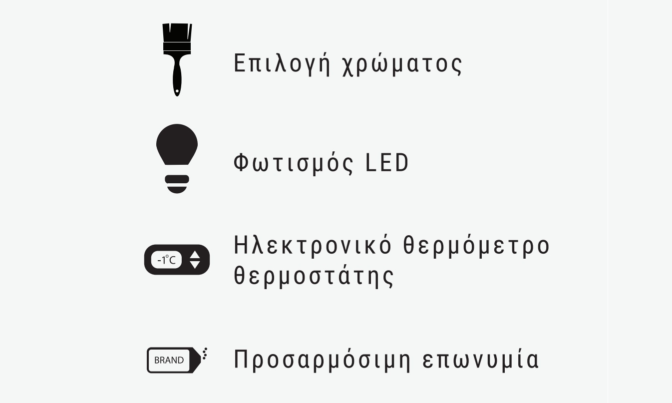 • Μόνωση οικολογικής πολυουρεθάνης • Ψύξη βεβιασμένης κυκλοφορίας • Αυτόματη απόψυξη • Χωρίς αποθήκη • Αντιθαμβωτικό σύστημα αέρα • Plexi glass νυκτός και θήκη χαρτιών στο πίσω μέρος • Ανοιγόμενα αποσπώμενα κουρμπαριστά κρύσταλλα • Άνοιγμα πόρτας 510x380mm • Πάσο εργασίας 230mm στο πίσω μέρος • Εξατμιστής νερού • 2-6°C