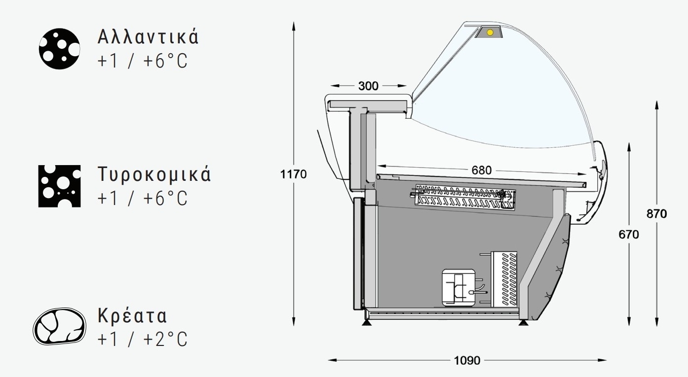 • Μόνωση οικολογικής πολυουρεθάνης • Ψύξη βεβιασμένης κυκλοφορίας • Με ενσωματωμένο ή χωρίς ψυκτικό μηχάνημα • Αυτόματη απόψυξη • Ψυχόμενη αποθήκη φυσικής κυκλοφορίας με άνοιγμα πόρτας 510x380mm • Εξατμιστής νερού • Plexi glass νυκτός και θήκη χαρτιών • Ανοιγόμενα αποσπώμενα κουρμπαριστά κρύσταλλα • Εσωτερικό βάθος βιτρίνας 680mm • Πάσο εργασίας 300mm στο πίσω μέρος • 2-6°C