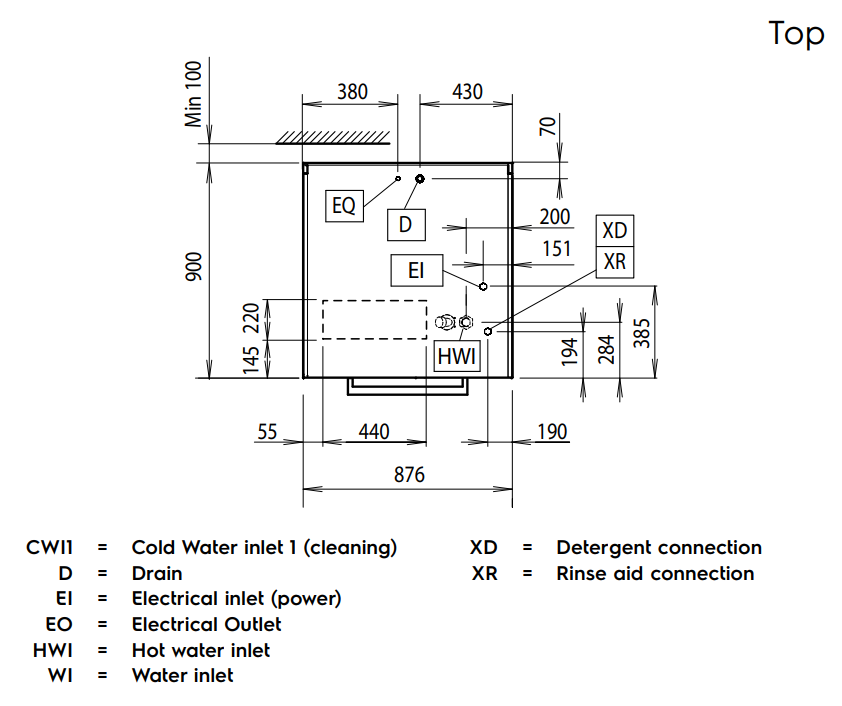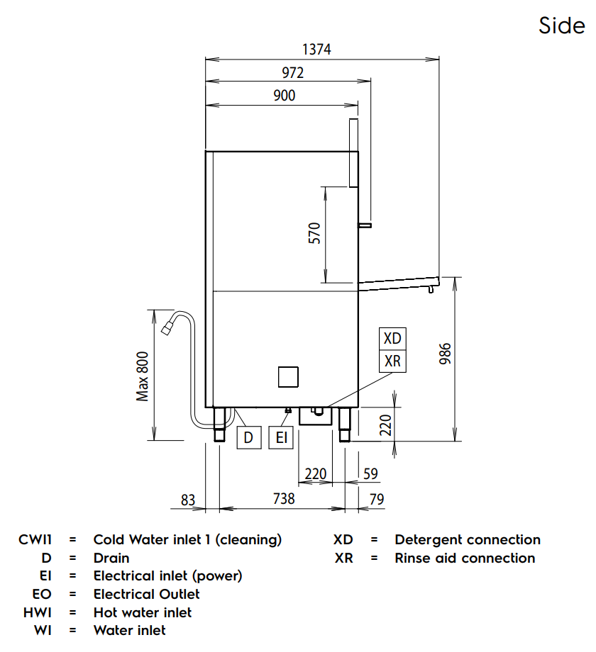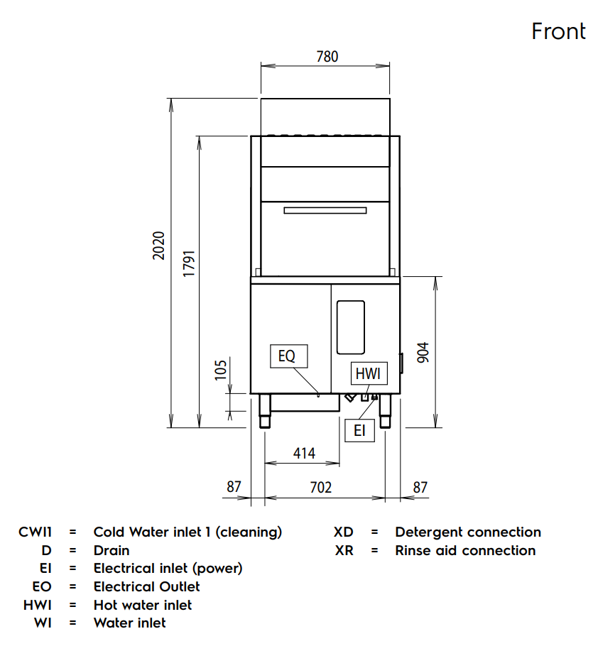 • 304 AISI stainless steel front and side panels, wash tank, tank filter and wash and rinse arms.