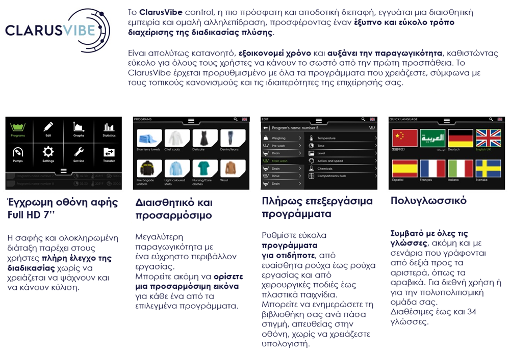 Το ClarusVibe είναι από τις πιο εύχρηστες διεπαφές στον κόσμο της επαγγελματικής πλύσης και έχει σχεδιαστεί για να προσφέρει έναν έξυπνο και αβίαστο τρόπο διαχείρισης της διαδικασίας πλύσης.