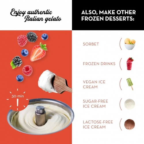 Απελευθερώστε τη δημιουργικότητά σας: με το Mini μπορείτε να παρασκευάσετε κλασικά παγωτά, φρέσκα σορμπέ, ξεδιψαστικές γρανίτες και ακόμη και παγωμένο γιαούρτι. Θέλετε κάτι ξεχωριστό; Πειραματιστείτε με συνταγές vegan, χωρίς ζάχαρη ή λακτόζη, για να ικανοποιήσετε κάθε γούστο και να κάνετε όλους τους καλεσμένους σας ευτυχισμένους.